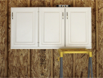 Connie gave us the cabinets after she remodeled her house. We were living in our little student housing apartment at the University of Utah. When you're living in student housing and someone calls you up and says "hey, do you want some cabinets?" you don't hesitate to accept. When we left student housing and moved into our castle on Downhill Road we thought we had plenty of storage space so the cabinets were plunked down on the garage floor and there they stayed. We wanted to make sure we did a good job of hanging the cabinets - a job that Grandpa Ray would be proud of - so we decided to stabilize one end, place a level on top of the cabinets, and then adjust the other end. We hauled out the ladder and Nancy helped me heave one end of the cabinets onto the top of the ladder. I then did my best Atlas impression and held up the other end while Nancy checked the positioning with the level. True carpenters will tell you that the level we used was too short considering the length of the surface we were trying to level. It's a good thing we don't care what true carpenters think. It turns out that trying to get the little bubble to line up just perfectly is like trying to scratch that one itch in the middle of your back. You know the one - no matter how much you contort yourself you just can't quite reach it and end up rubbing your back against the wall while everyone else stares at you and concludes you must have fleas. After several iterations of "up a little bit, down a little bit" we decided (actually, my weak muscles and lack of patience decided - I think Nancy would have been content to adjust that dang thing for another hour or so) it was "good enough" and started driving in the screws. Oops - the screws were too short and only the tip actually made it into the studs. We were worried that they wouldn't hold the load so we propped the cabinets up with the ladder and Nancy set off to Lowe's to procure some longer screws. I'm not a big fan of going to the hardware store - it makes me realize just how handy I'm not. Nancy doesn't seem to mind going so she usually ends up with that particular errand in our family. Anyway, Nancy did a Mario Andretti over to the hardware store and came back with just the right kind of screws. A little action on the DeWalt drill and viola! - we were in Cabinet Heaven. There was only one problem. Check the picture closely - can you spot it? It took us a while to figure it out but the light bulb finally came on ...