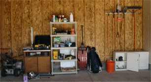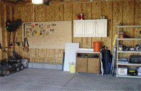 After some more cleaning, sweeping, and organizing we were ready to call it a day and drive the cars back into the garage. Hanging the cabinets on the wall and moving the shelves around gave us some much needed space. Not wanting to let good space go to waste, we spent the next several days filling the space up with all kinds of junk until we were back in the same place we started: a messy garage without enough room to move around in. Hmm, maybe for our next project we'll try putting some plywood on the rafters and making an "attic".