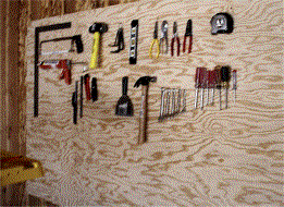 ...and we realized that we had hung them upside down Any idiot knows that the handles go on the bottom of the cabinet instead of on the top. Well it turns out that I'm not just any idiot. Nope, I'm an exceptional idiot. Nancy volunteered to unscrew the cabinets, flip them, and go through the leveling process again. I volunteered to move us back into our student housing apartment. There was no way I was touching those cabinets. "Besides", I kept telling Nancy, "with the handles on the top it means the kids won't be able to get into them." Nancy wasn't buying my "prevent the kids from getting into them" line because Nancy happens to be on the short side and it meant that she couldn't get into them as well. In the end, tired muscles won out and we decided to just leave them where they were. See, wimpiness does have its rewards! After a bit of cleaning and moving we were ready to hang the toolboard. I had decided to get the bigger size of plywood because I figured my meager collection of screwdrivers and pliers constituted "lots of tools" and I didn't want to "run out of room" on the toolboard. It turns out that the danger of us running out of room on the toolboard is right up there with the danger of Eskimos running out of snow. Once we had screwed the toolboard in place and put the nails in for the tools my puny tool collection looked almost silly on the toolboard. Oh well, now we've got plenty of room to grow. I was going to draw little black lines around the tools like Grandpa Ray used to do but I just couldn't bring myself to make that kind of commitment - so I just penciled them in instead.