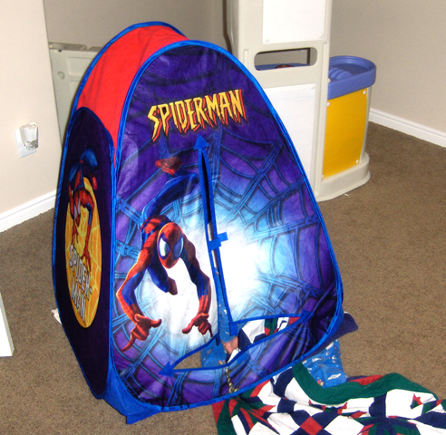 I opened up the flaps of his little Spiderman tent and, viola! There was Samuel, sound asleep on the floor with his head under the tent and his legs sticking out the bottom.